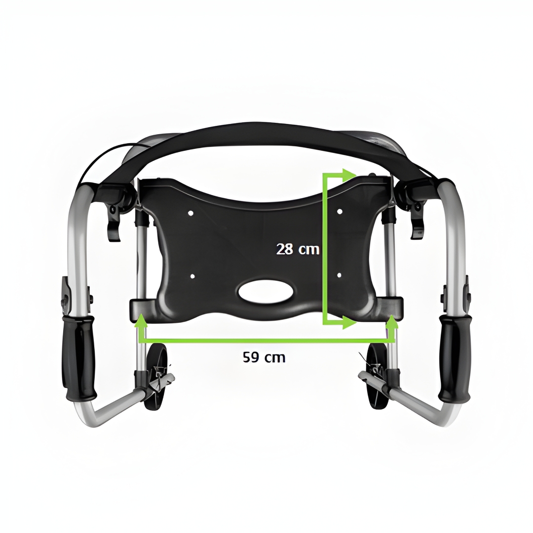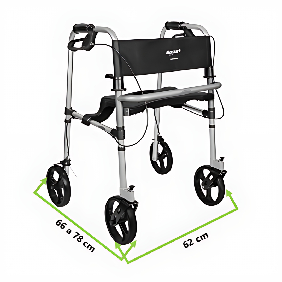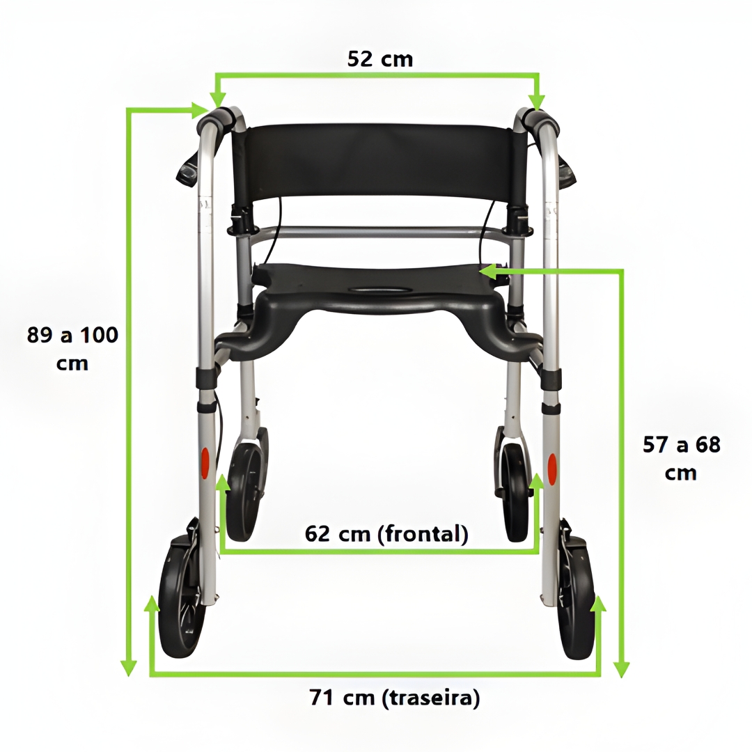 Contém quatro rodas com dimensões adequadas para locomoção em ambientes internos, externos e solos irregulares. As rodas dianteiras são giratórias, podendo ser fixadas para deslocamento linear, enquanto as traseiras apresentam sistema de travamento para a segurança do usuário em repouso. Com estrutura resistente e freios, o andador possui assento e apoio para costas, proporcionando conforto e segurança para repouso do usuário. O dispositivo contém cinco níveis de ajuste de altura, possibilitando a utilização por usuários de 1,60m a 2m.