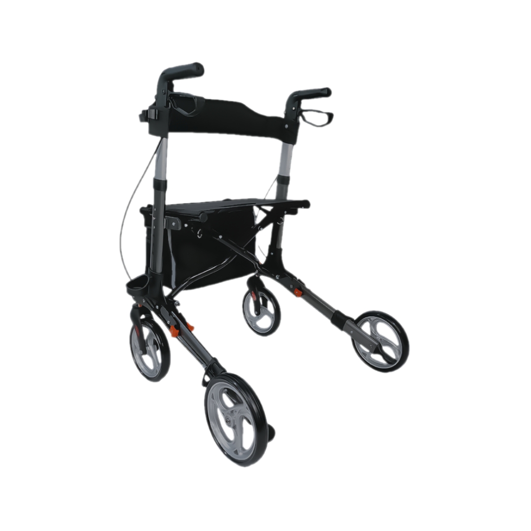 Dispõe de 4 rodas de 8”, sendo as 2 dianteiras com garfos giratórios. Maiores do que as rodas de andadores convencionais, proporcionam mais estabilidade e leveza para o condutor durante os deslocamentos.