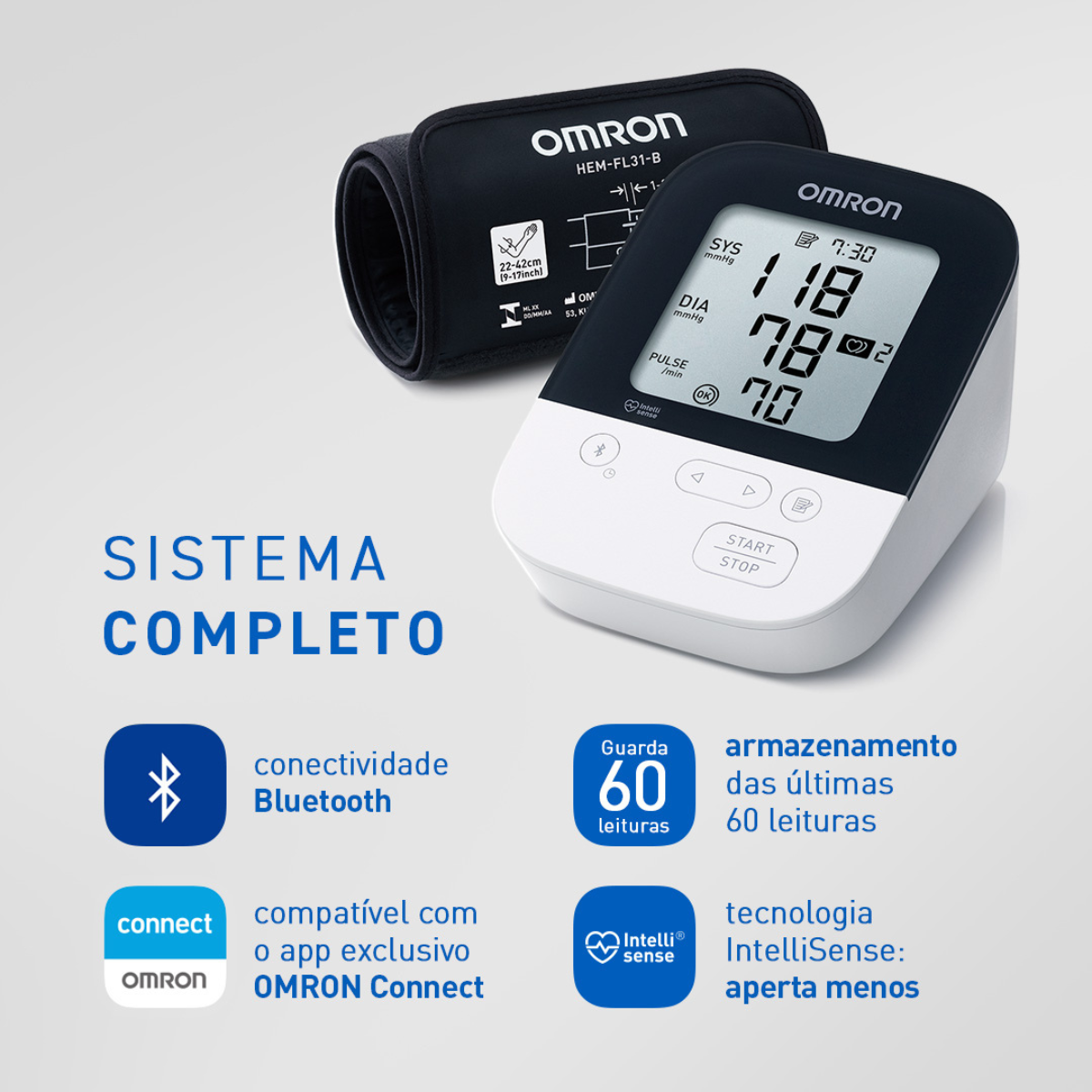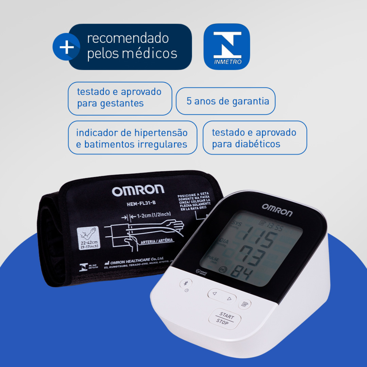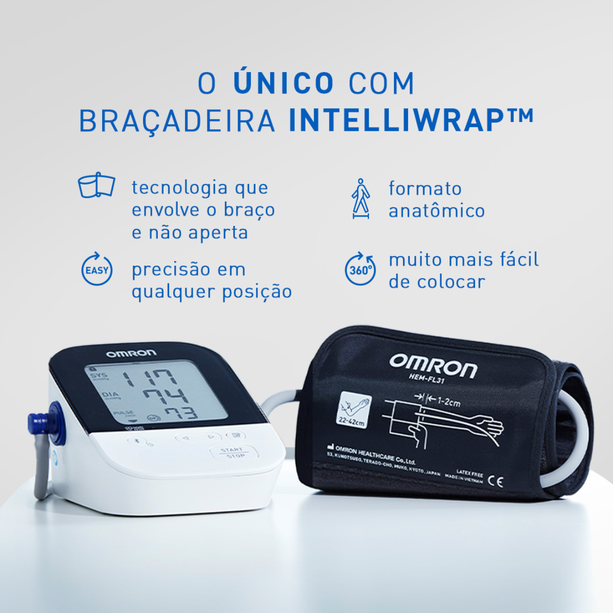 Descrição Monitor de Pressão Arterial de braço progress HEM-7156T Omron Intelli Wrap (Braçadeira Inteligente) ajuda evitar os erros mais comuns durante a medição. Ela é mais fácil de colocar e para segurança extra, está braçadeira tem cobertura expandida, infla em volta de todo o braço, assegurando uma leitura precisa. Características Conexão sem fio com tecnologia Bluetooth®; Detector de batimentos cardíacos irregulares; Detector de movimento corporal; Valor médio das últimas leituras; Indicador de pressão arterial elevada; Guia de aplicação da braçadeira; Memória para 60 registros; 1 usuário mais modo convidado; Tecnologia Intellisense Inclui 1 braçadeira Intelli Wrap (22 - 42 cm); 5 anos de garantia. Itens inclusos 1 - Aparelho de pressão arterial de braço 1 - Braçadeira Intelli Wrap HEM-FL31-B (22-42cm) 1 - Manual de instruções 1 - Guia de conectividade 1 - Bolsa de armazenamento 4 - Pilhas AA