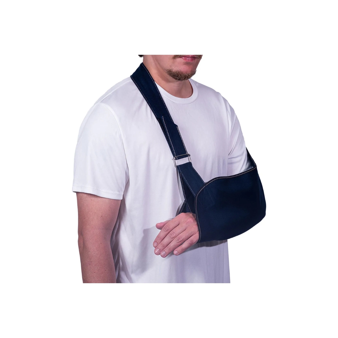 Pode ser utilizado tanto no braço direito quanto no braço esquerdo, através de ajuste da alça com apenas uma mão. Confeccionada em algodão, é lavável, resistente e seu formato não restringe o movimento do ombro.