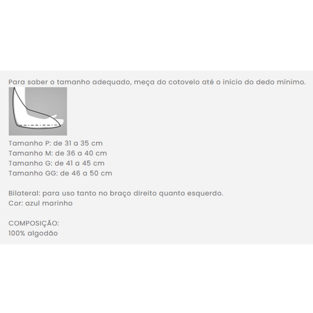 Para saber o tamanho adequado, meça do cotovelo até o início do dedo mínimo.